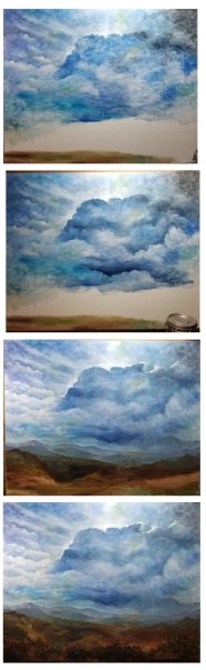 The canvas is relatively large for me at 24 by 30″ but I’ve been finding that painting a little larger allows me the freedom to use the larger brush and to be more gestural as I lay it out. The subject matter for this one was a little bit of an aggregate of several images that I had. First was a photograph that I had taken years ago close to home that had great light behind a good storm cloud. It wasn’t your basic thunderhead, but more of a whole weather front and it intrigued me.