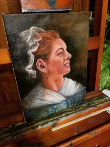 That being said however, I decided to spend the day in the company of my sweetheart and work at my easel. I didn’t have a particular person in mind but wanted to practice on the human face. This experiment is with direct but slightly back light on a female face.
