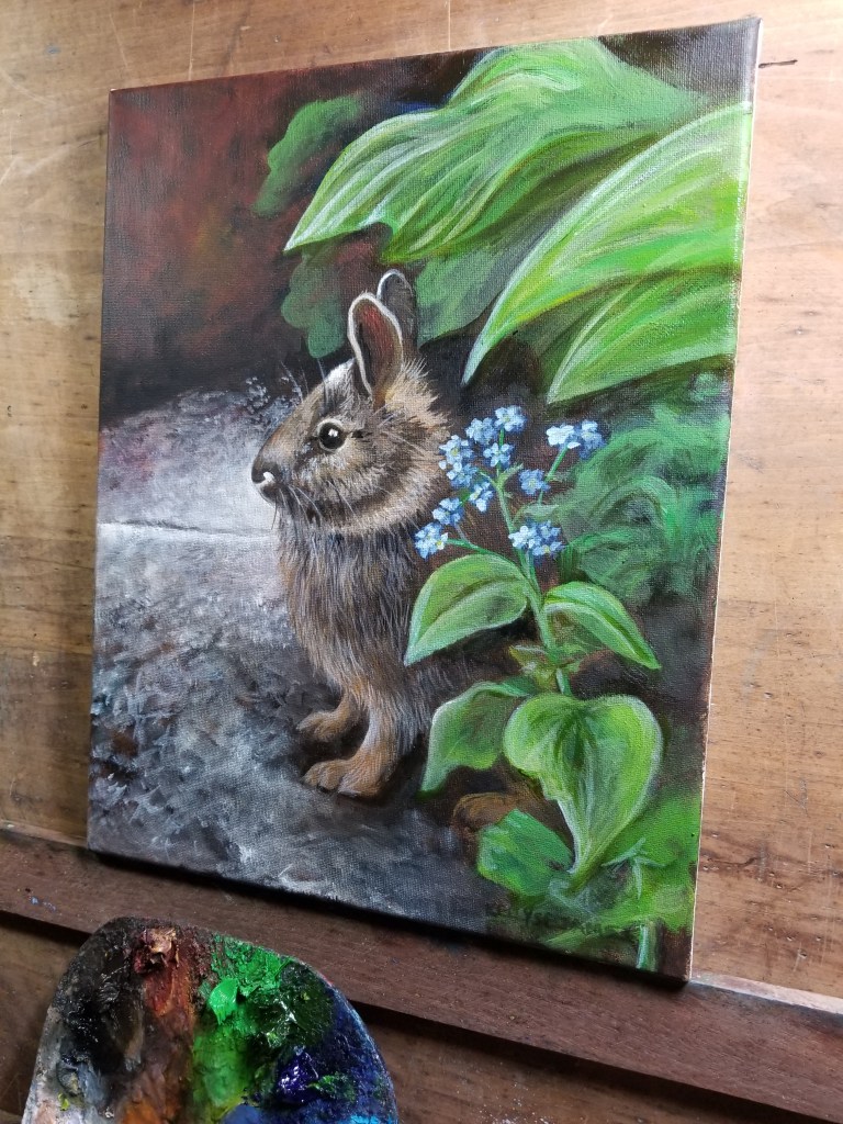 Then, the other day I decided to do a quick study of him because bunnies are, like I said, pretty cute. So I put up a canvas, painted and got almost done before stopping for supper. As I stood in the kitchen talking to my husband we heard the unmistakable sound of a larger animal crashing through hosta leaves and then the unmistakable noise that a rabbit can make. I knew what it was in an instant and ran to the kitchen window to see a feral cat from the neighborhood racing down the sidewalk toward the alley with something larger in its mouth.