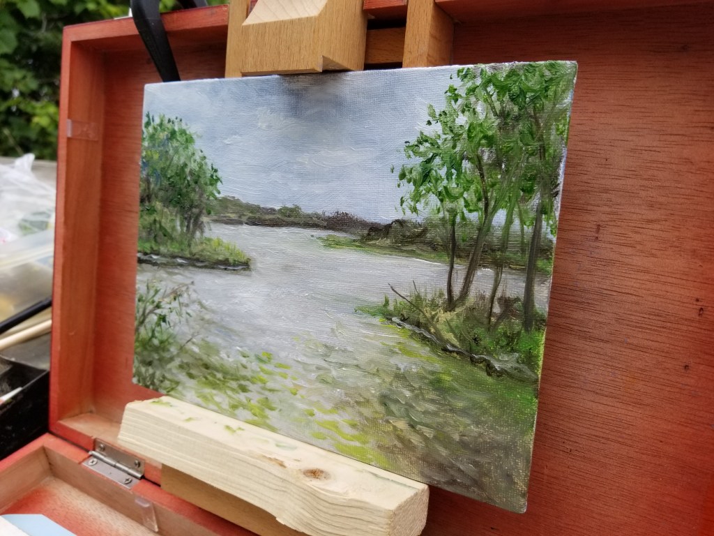 My bag separated out brushes in a better way, and I added more small clips that I could reach for at a moments notice. I found a small palette that fit the new pochade box that we cobbled together. We self destructed one of my small easels and use the sliders to hold a small painting. There were some other changes that I needed to make too. One of them was that I needed to find a way to keep my turpentine hanging up closer for the quick dip to my palate. I also needed to make sure that I always had my blast jacket and hat with me because I now sunburn easier than I ever did before, and this weather had had a little chill in the air. [I’m loving it by the way.]