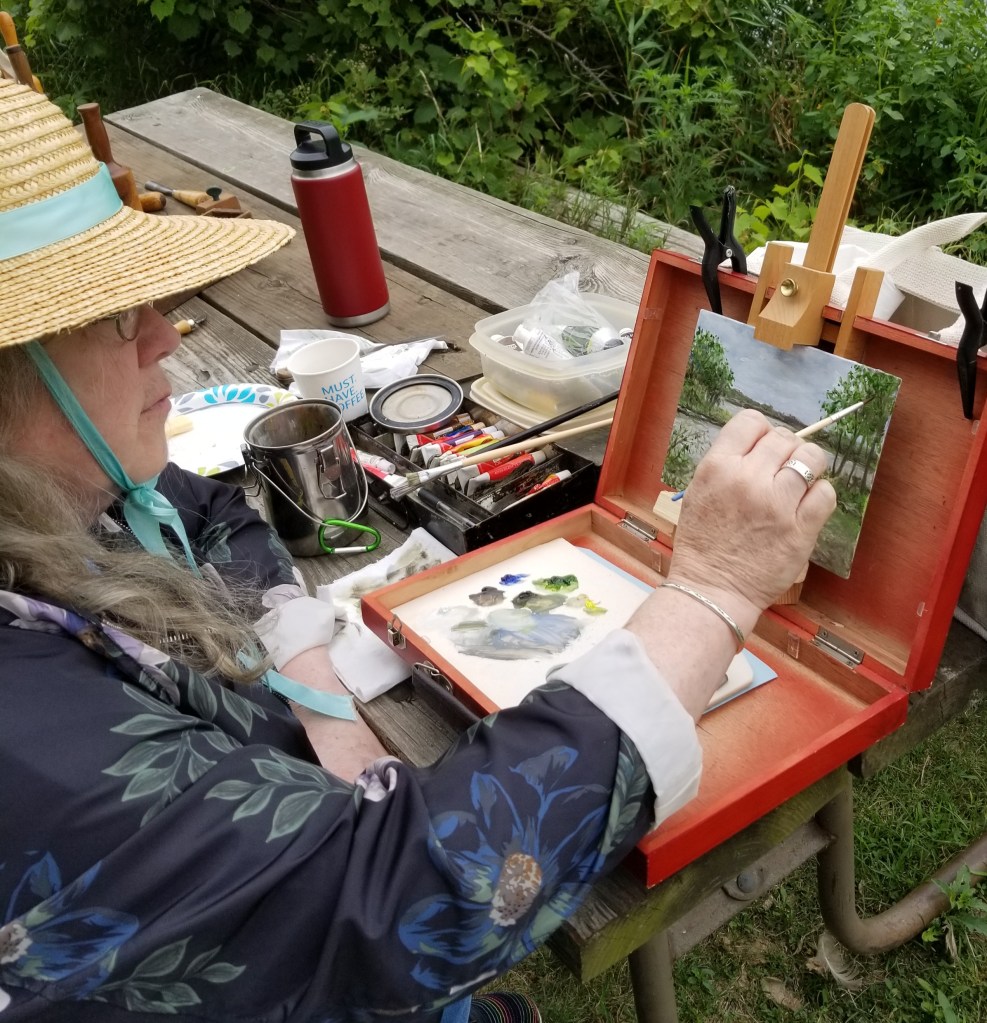 But here’s where the other piece comes in. Artists in the field painting plein aire attract attention. Unlike joggers, walkers, or bikers, artists are stationary for several hours at minimum. People come up to us while we’re painting. It’s part of the fun. People want to watch and engage, they get excited, and they get close. So whether you believe in masks or not, in my opinion everyone needs to respect others and wear them.