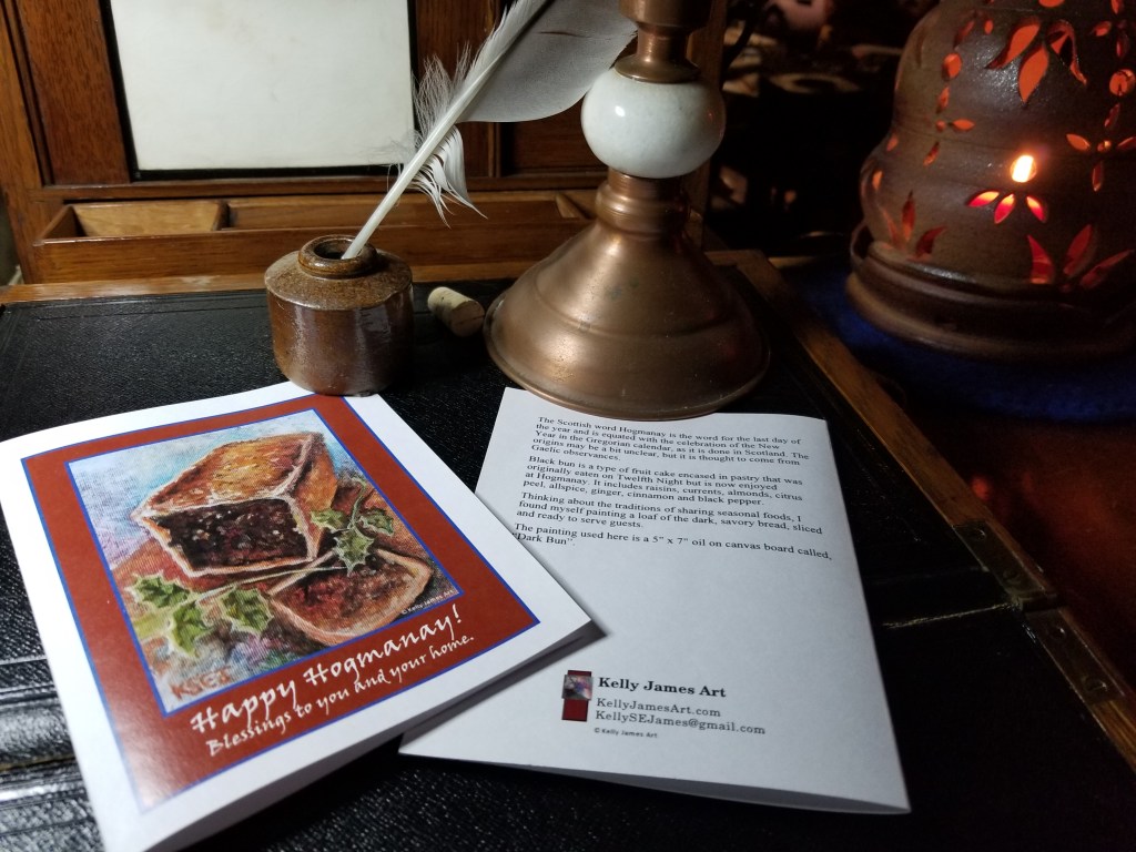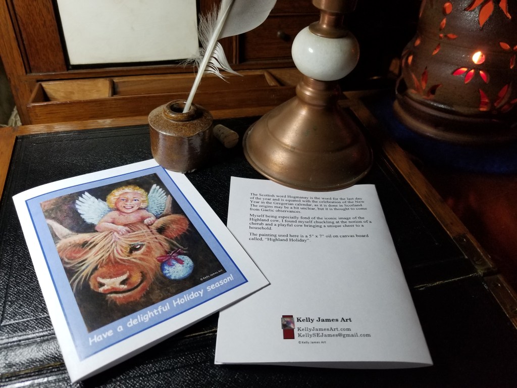 As I thought of the various holidays coming up and how different they will be this year I decided to paint a few images for personal cards to send to friends and family. Thinking of a variety of traditions and my Gaelic roots I found myself focusing on the traditions of Scotland. When I printed the images into cards I decided to share them more openly so that anyone who might want to write the old fashioned sentiments to friends or family and fancy the less ordinary greeting card, have more choices. Today, I added the following four cards into the Gallery – gift shop.