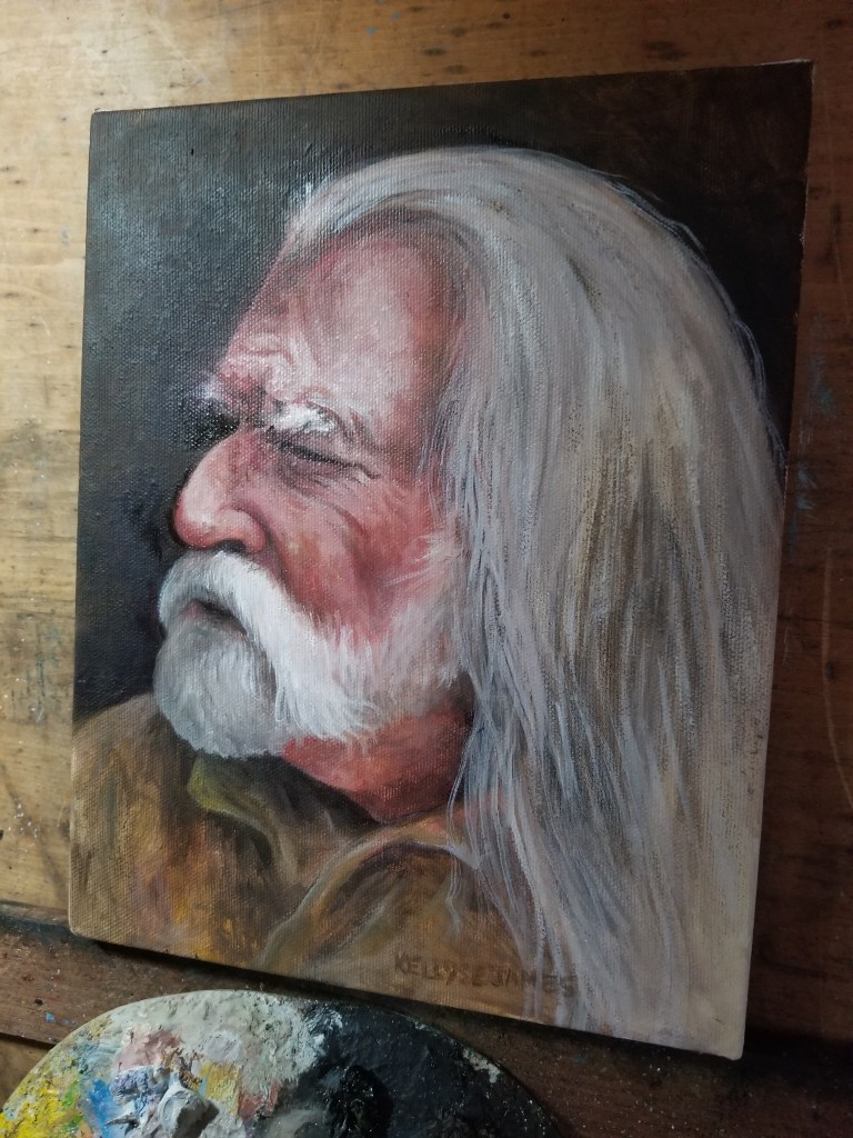 It’s sad what our society has deemed beautiful. It it has become synonymous with youth, or body type, or any number of other societal designations. I looked at our wedding pictures and even put one up in my social media page because it’s fun to see us on our wedding day. As I looked at my face and I looked at my husband’s face I saw that they were beautiful. I also realized that the beauty I see is the level of love and happiness coming out of my eyes and my smile that was the beauty, not my age. It was the twinkle in my husband’s eye and the mischievous smile and tilt of his head that was the beauty. Sometimes when I sit at the kitchen table and I see him concentrating I am enthralled. Watching him squint at the laptop screen as he reads the conversations that his students are having about history in his online class, or when he is looking out the window dreaming our next adventure, or even problem solving a task that he wants to accomplish, his face reflects his mind. Here is that same fabulously beautiful face of my brilliant friend. Yes, it is changing. There are different lines, different places for the light to reflect, and even the color of his hair is different. Whiter in bright sunlight than at any other time, it becomes beautiful silver threads and the lines in his face become reflections of that brilliant mind. Perhaps this is the core of the statement, “beauty is in the eye of the beholder”. If that is the case, and I can assure you that it is, I am thankful to the point of tears that I see beauty in such abundance in everything in my world. I pray to God that this remains my armor against the ugliness that has nothing to do with visual representation. In continuation of gratitude by counting my blessings, I thank God for my husband. I also thank God for my ability to push paint around on a canvas and capture all of the wonderful things He is showing me. I hope you enjoy today’s painting, an 8″ by 10″ oil on canvas study called, “Ray”.