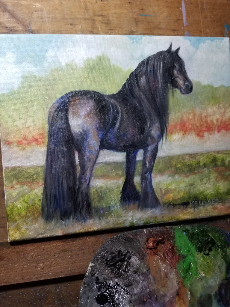 Enjoy your tomorrow. Celebrate your tomorrow. I hope you enjoy today’s painting -a quick oil sketch- of a Friesian horse.