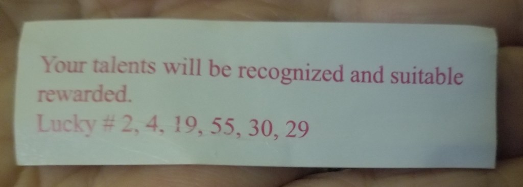 Maybe we need to just have our down time. Feel it. Own it. Then find something just as random but positive to latch onto and get back up and begin again. It can be a small, positive image or moment. Here – borrow my fortune cookie from the other night. I choose to believe this message because cookies are unbiased and ALWAYS correct.