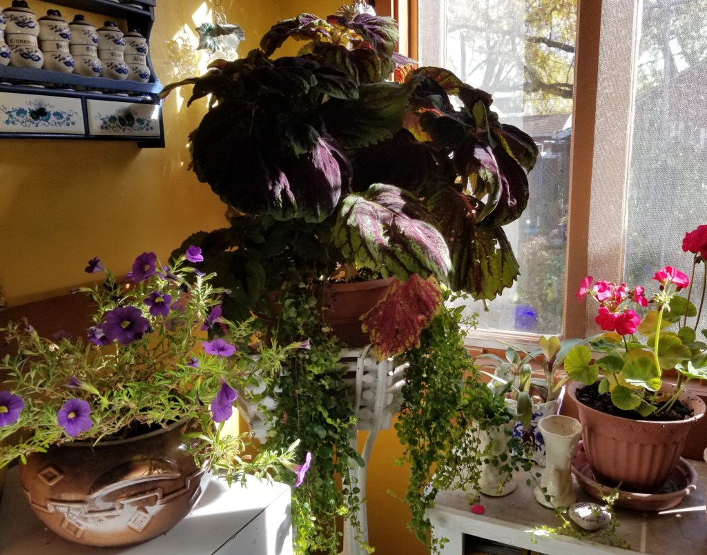 I have scurried in some of the plants from my patio and flower gardens that I want to overwinter. Some will live as they are and some will have a midwinter pruning and restart of cuttings in preparation for Spring. Either way it’s so uplifting to have all of the greenery and color inside the house.