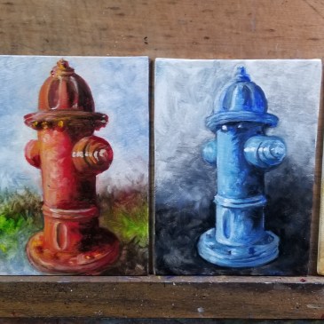 My friend, an accomplished plein-aire painter himself, suggested that I choose one subject (such as a fire hydrant) and paint it repeatedly so that it becomes more about the process than about the subject. My work experience as an illustrator has actually rooted my artwork in the subject. I don’t think my friend was questioning the validity of me being a subject painter but rather the priority the subject had over my act of painting. He implied that this could inhibit any next-step development that I might seek. I agree that this is true. Learning to move past naturally occurring sticking points, such as fixating on the subject and for me, the story, can in fact weaken my work.