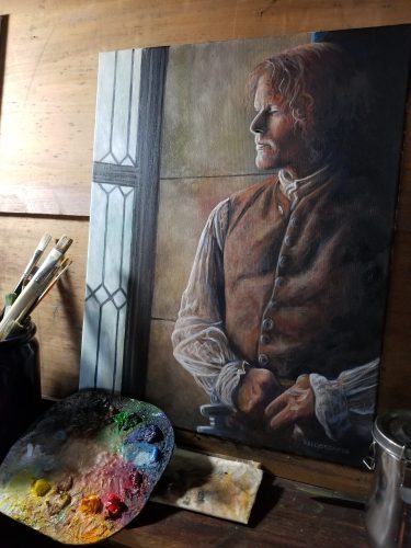 In one season of the Starz production of Outlander [based on the Diana Gabaldon book series] I had seen a picture of an actor (Sam Heughan) and liked the lighting. As a result, I decided to paint the image. Here’s where copyright comes in. Copyright law dictates that I cannot display the finished painting in a gallery, sell the original, or make prints of it until I get back permission from the actor and from the owners of the movie. It’s too bad really, but I completely understand it. Intellectual property, whether it be the creation of who you are and your place in the world, or the intellectual property of the person who made the movie or owns those rights, must be respected. I enjoyed painting it and I share it here at an angle in my home so you cannot reproduce it. The photo doesn’t do it justice as it lacks the quality that seeing it truly does. I had fun, and it was good practice.