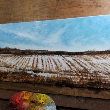 This is just one of those lovely, early Spring mornings when I woke up without the alarm, had a great breakfast with someone I love, and got to spend some time at the easel while thinking about the drive last weekend. This time of the year the snow is melting off and you can see the corn stubble, and everything is pretty in another unique way. The lines on the land made by last year’s crops can be lovely.
